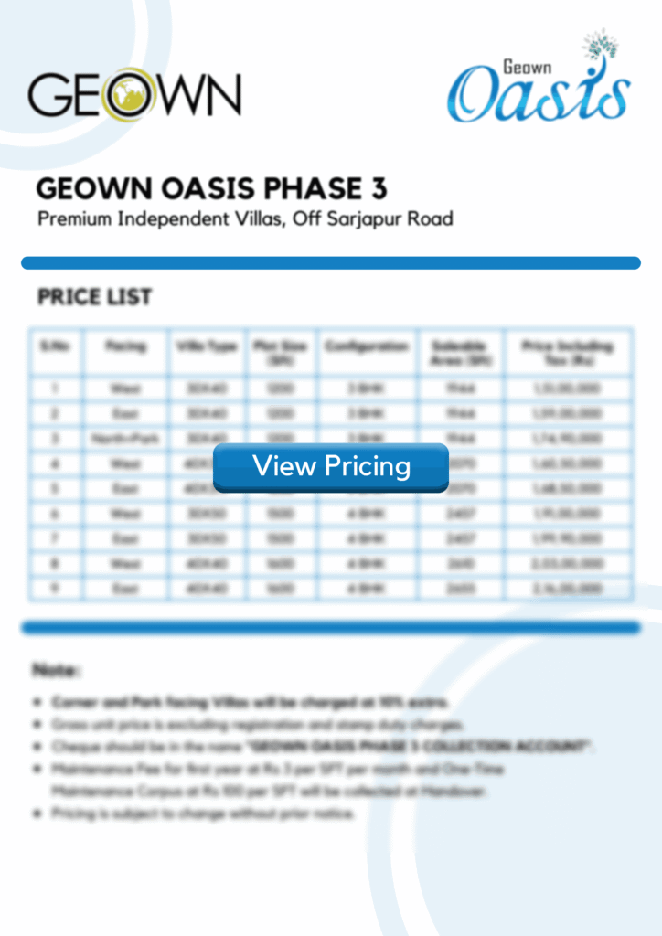 Presenting Geown Oasis Phase 3, an exquisite villa community by Geown Casper Properties, huddled in the serene embrace of nature just 2.5 kilometers off Sarjapur Road. Sprawling across 6 acres of pristine greenery, this magnificent community offers luxurious 3 and 4-BHK villas in Sarjapur.